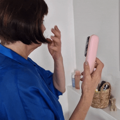 Brush through dry hair like normal. The heated ceramic bristles straighten, smooth, and add shine.